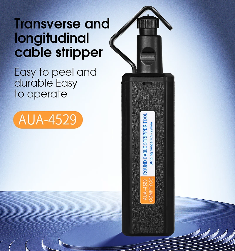 COMPTYCO AUA-4529/1940 Desnudador de Fibra Óptica. Esta herramienta de desstriado puede manejar cables de fibra óptica de todos los tamaños. Puede realizar desnujes longitudinales y transversales con tamaños desde 4.5-29mm y 19-40mm. Pequeño y sencillo, es perfecto para desnujar cables en la instalación y mantenimiento de redes de fibra óptica.