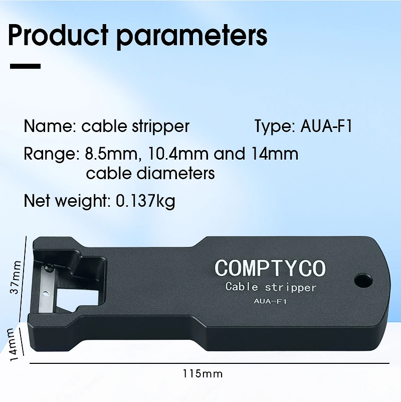 El desforrador de fibra óptica COMPTYCO AUA-F1 está diseñado para el desforrado longitudinal de cables de fibra óptica con diámetros de 8.5mm, 10.4mm y 14mm. Fabricado con materiales de alta calidad, ofrece durabilidad y fiabilidad, lo que lo hace ideal para su uso en la instalación y mantenimiento de redes de fibra óptica.