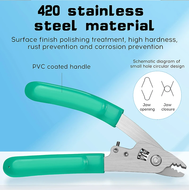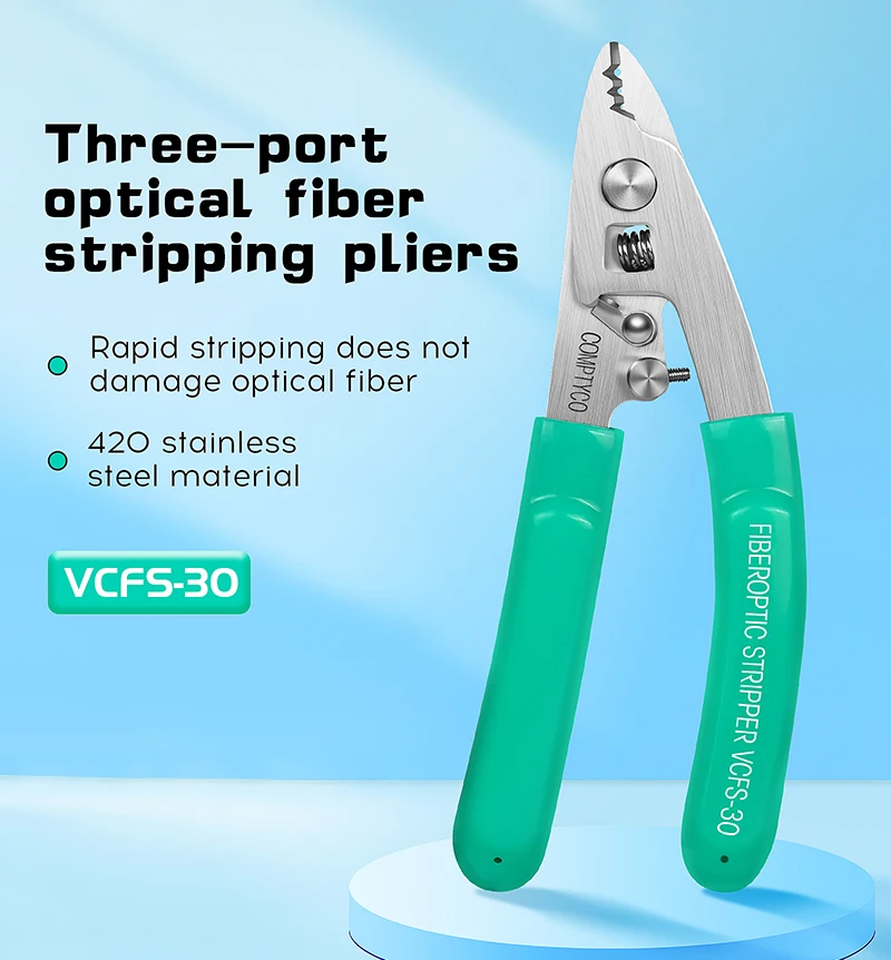 El desmonte de fibra COMPTYCO VCFS-30 está hecho de acero inoxidable con un diseño de tres puertos, especialmente diseñado para desmonte de cables de caída FTTH. Su función de desmontaje precisa asegura la eliminación limpia de los recubrimientos de fibra y las chaquetas exteriores, por lo que es una herramienta ideal para la instalación y el mantenimiento de fibra óptica.