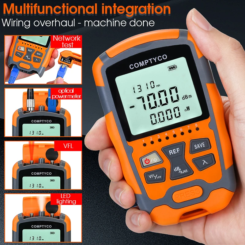 Detector de fibra óptica con carga COMPTYCO MINI, identificador de fibra óptica con carga OFI+OPM+30mw VFL+LED 4 en 1, comprobador de fibra óptica SM MM naranja