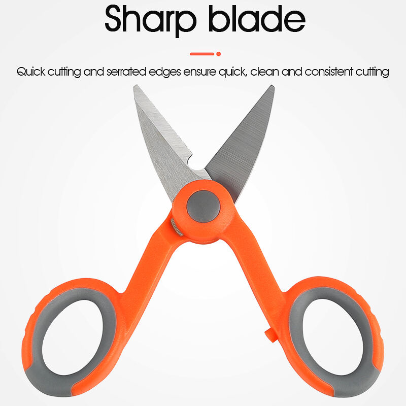 Tesoura de fibra óptica: design serrilhado, capaz de cortar diversos plásticos, como revestimentos de cordões de fibra óptica, cabos Kevlar, fios de aramida para cordões, etc.